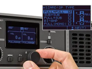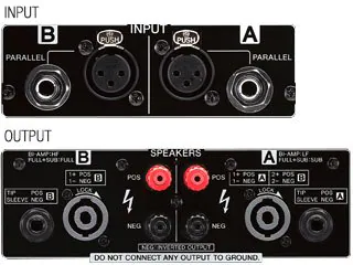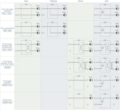 Amp Mode allows the user to configure the system without difficulty by selecting the input routing and output routing. A total of 15 types of patterns can be selected. – Input routing (Dual/Parallel/Single/SUM)- Speaker System Structure (FULL+FULL/SUB+SUB/FULL+SUB/Bi-Amp/Boost Full/Boost Sub)