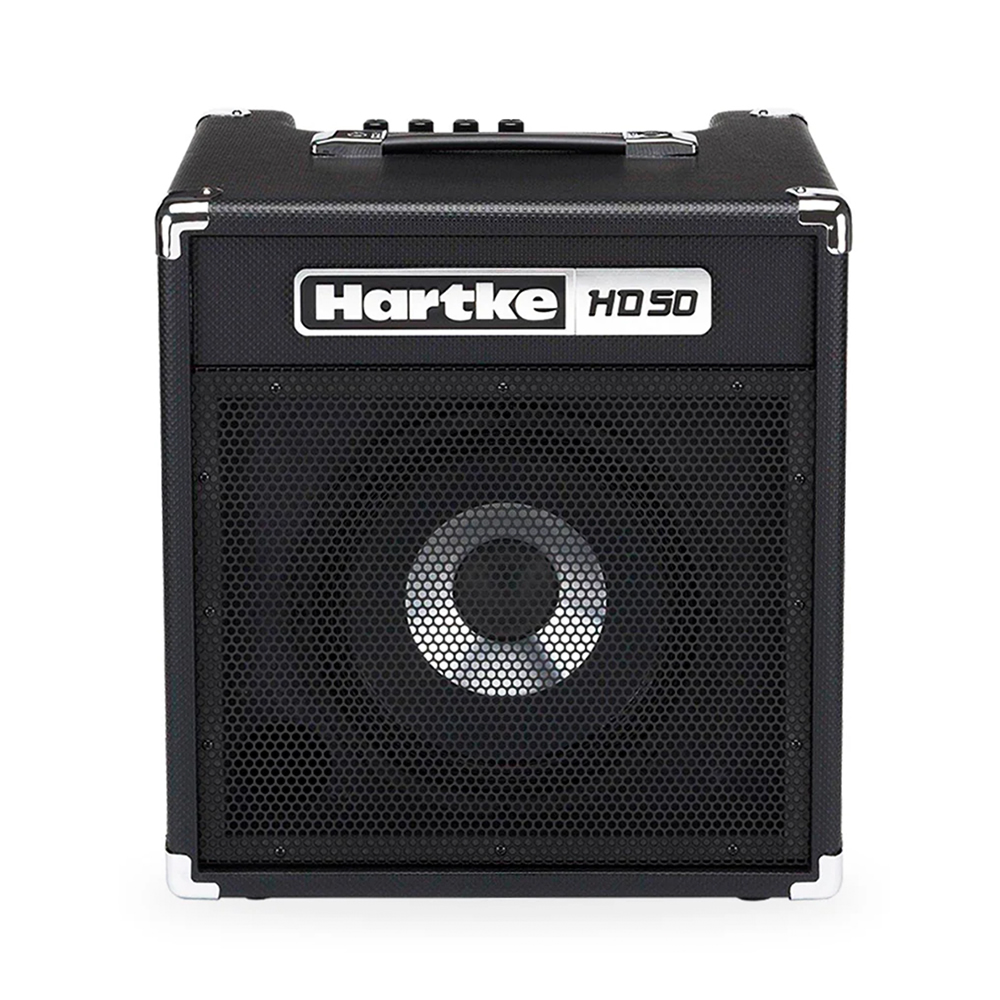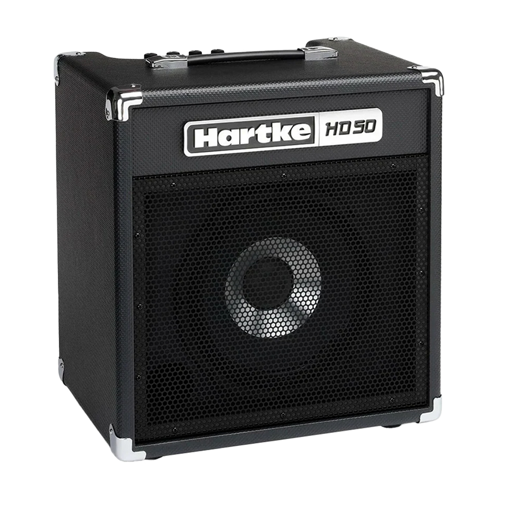 Combo para bajo de la marca Hartke modelo HD50. El Hartke HD50 ofrece 50 vatios de potencia con un altavoz HyDrive de 10, que combina aluminio y papel para un sonido claro y con pegada. Su diseño compacto incluye controles de volumen, graves, medios y agudos, además de entradas para bajos activos y pasivos, entrada auxiliar estéreo y salida de auriculares para práctica silenciosa. Con limitador incorporado, rejilla metálica duradera y asa de transporte, es una opción práctica y potente para ensayos o presentaciones pequeñas.
