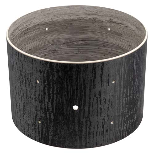 Nuestros aros están fabricados con un revestimiento interno y externo de HPL (Laminado de Alta Presión), que define tanto el acabado como el color. Doce capas de haya interna se unen en la misma dirección, usando un pegamento especial de PU. Así es como se crea un aro de tambor rígido con fuertes propiedades mecánicas. Con un grosor de tan solo 8 mm.