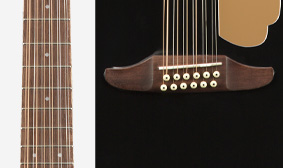 - Mástil de caoba con perfil en forma de “C” delgado y cónico; diapasón y puente de nogal
