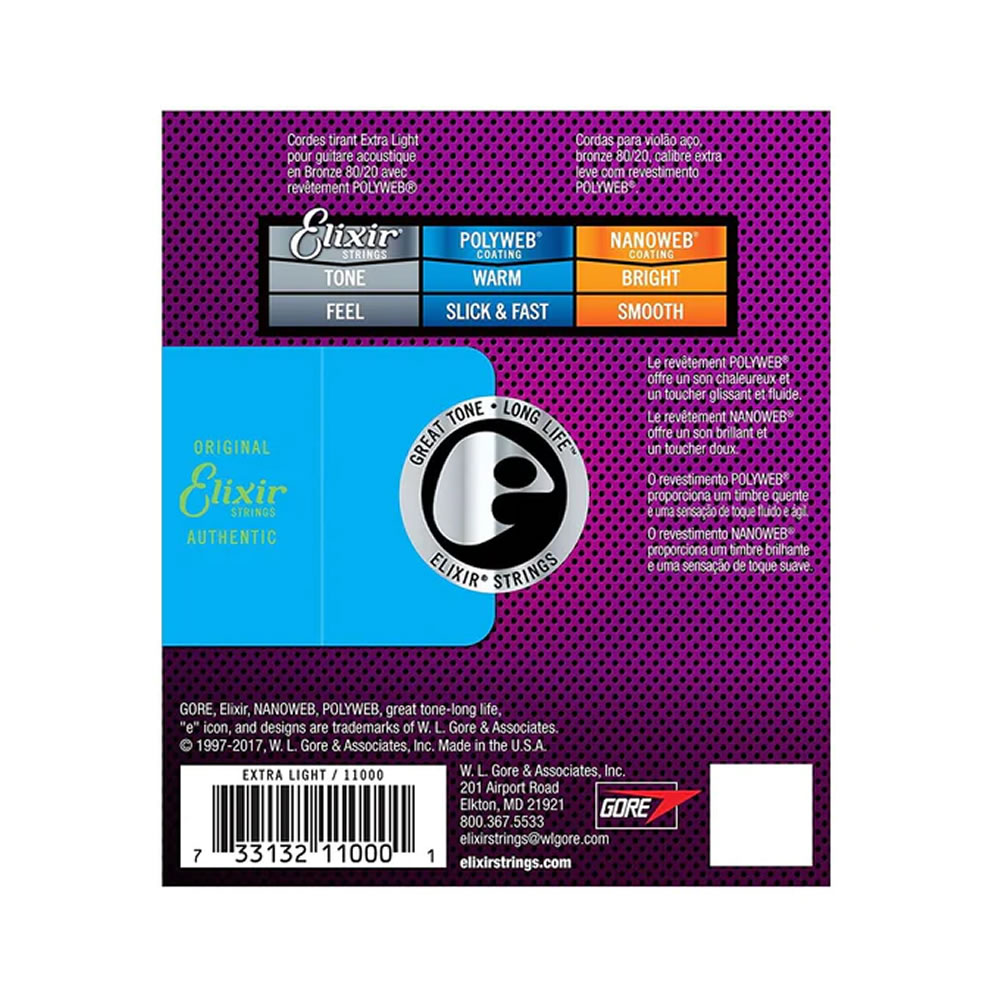 Las cuerdas ELIXIR cuentan con el recubrimiento original POLYWEB que, proporciona una sensación suave y lisa que evita que las cuerdas interfieran en el juego. La tecnología de recubrimiento patentada protege a las cuerdas contra la corrosión común y prolonga la vida del tono más que las cuerdas recubiertas o no recubiertas de cualquier otra marca.