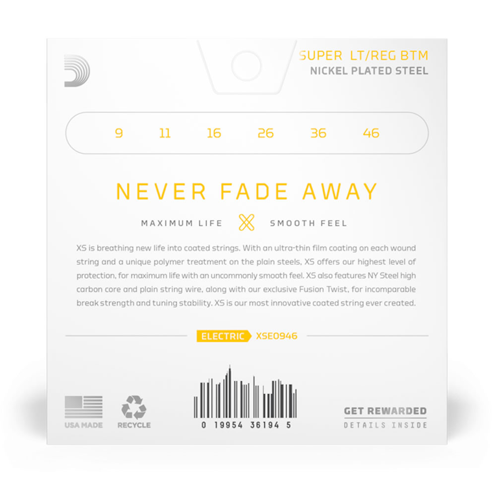 Las cuerdas para guitarra eléctrica recubiertas de níquel XS proporcionan la vida útil más larga de cualquier cuerda para guitarra eléctrica D’Addario. Recubiertas con nuestro innovador revestimiento XS, estas cuerdas eléctricas de primera calidad alcanzan la máxima vida útil y una sensación suave y rápida sin amortiguar su excelente tono. Construidas con un núcleo de NY Steel, alambre envolvente de acero niquelado reformulado y tecnología Fusion Twist, las cuerdas XS Nickel cuentan con una resistencia y estabilidad de afinación superiores, además de armónicos más ricos, mayor claridad y una definición notable en cada barrido, deslizamiento y curvatura. Este juego de calibres 09-46 Super Light Top/Reg Bottom tiene más tono de gama baja que Super Light, a la vez que se mantiene flexible para las curvas.