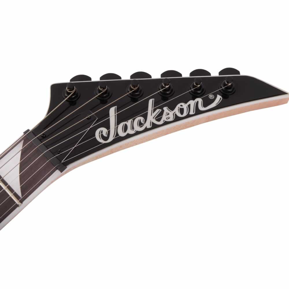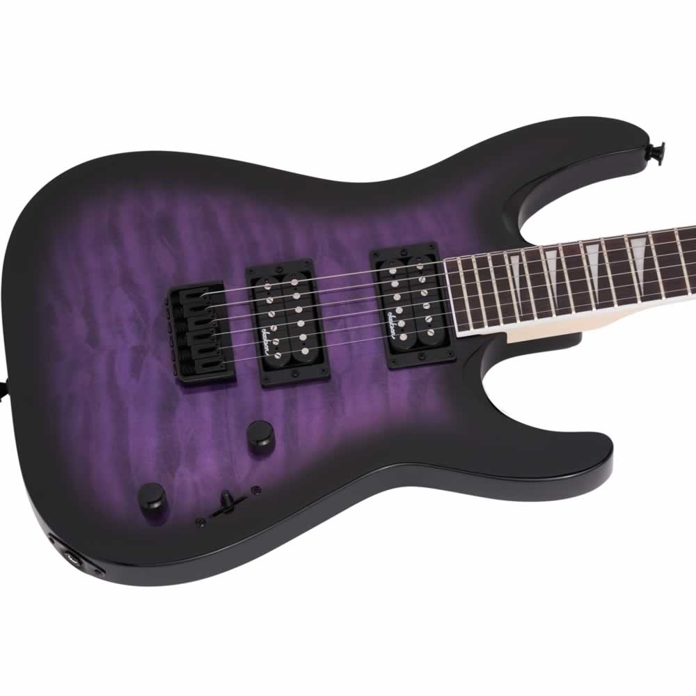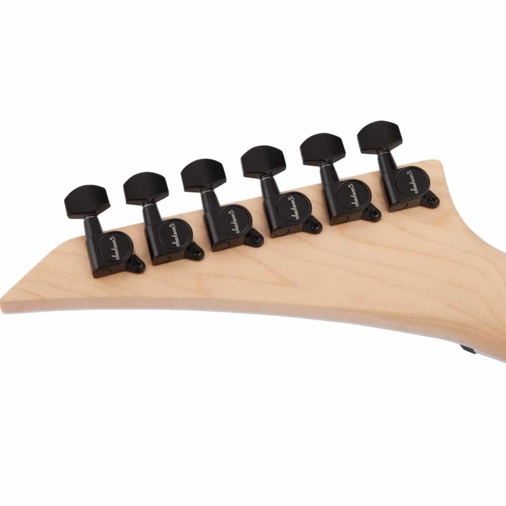 - Disponible en Transparent Black Burst, Transparent Green Burst y Transparent Purple Burst con clavijero Jackson puntiagudo de 6 en línea de color negro y herrajes de color negro.
