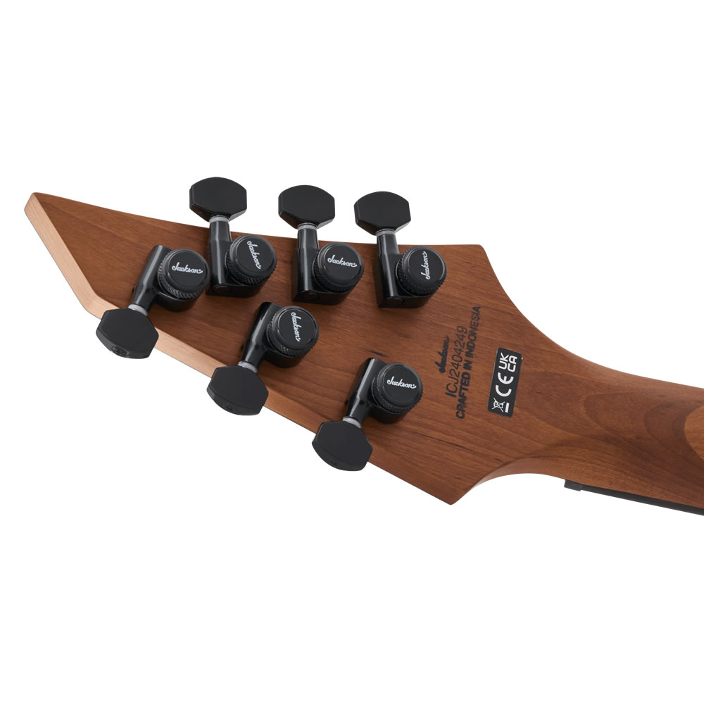 Disponible en Red Crystal o Blue Sparkle con un clavijero Jackson 3×3 AT-1 invertido a juego, este Pro Juggernaut exclusivo también cuenta con un puente rígido Jackson HT6 con cuerdas a través del cuerpo, clavijas de bloqueo de fundición a presión selladas Jackson, cierres de correa de doble bloqueo Dunlop® y una funda de transporte.