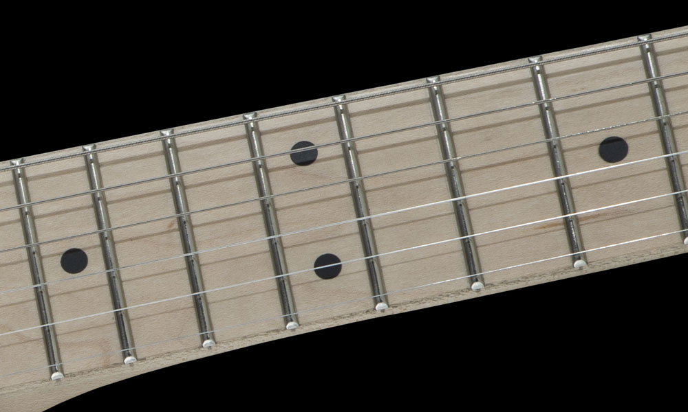- Diapasón de arce de radio compuesto de 12″-16″ con 22 trastes jumbo e incrustaciones de puntos negros