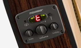 Un sistema de pastilla/preamplificador Fishman Classic Design agrega un rendimiento amplificado sin igual con una variedad de controles integrados a su instrumento acústico sin comprometer su tono puro, rico y resonante. El sintonizador incorporado está convenientemente ubicado justo donde puede verlo.