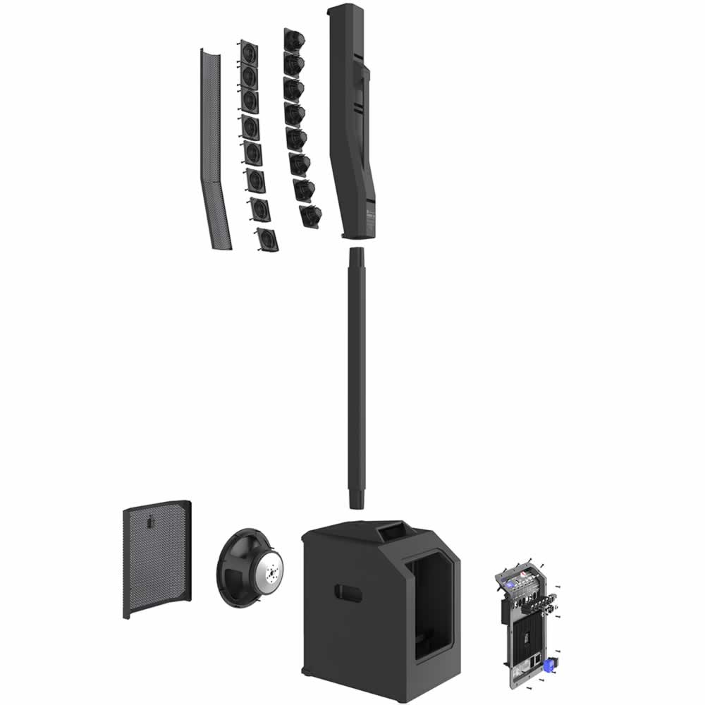 La matriz de columna de rango completo y sus ocho drivers ligeros de neodimio de 3.5″ pulgadas brindan una cobertura ultra ancha de 120° grados de ancho de banda completo mediante guías de onda patentadas, la cobertura vertical asimétrica de 40° grados formada en matriz, garantiza que la salida acústica se dirija hacia los espectadores tanto sentados como de pie.