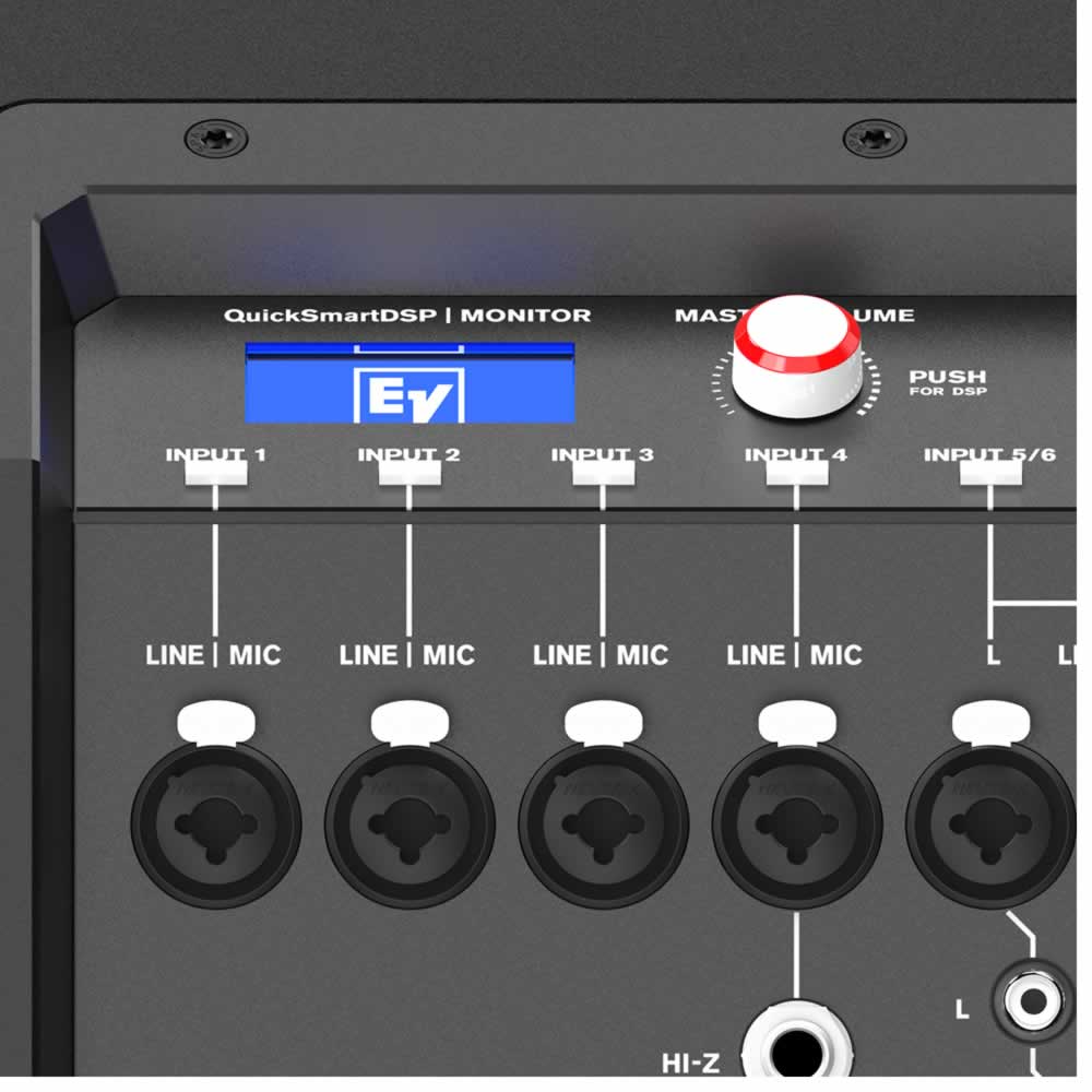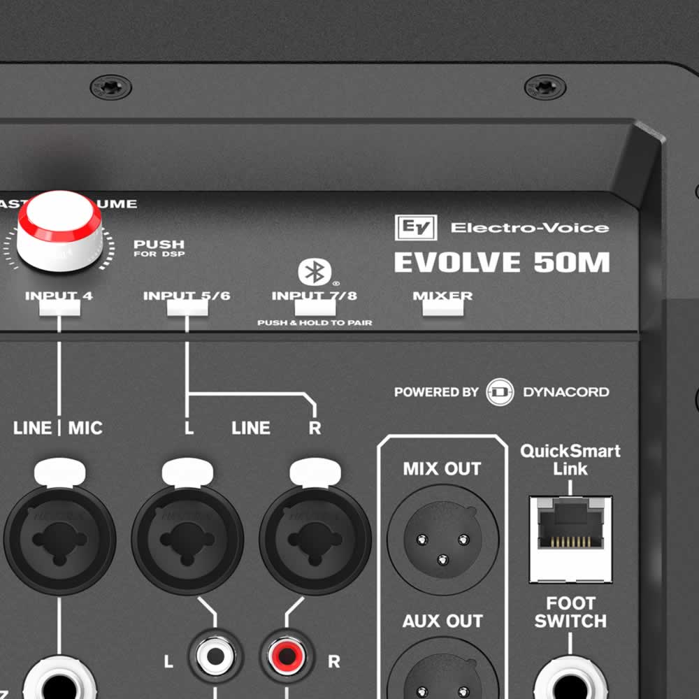 Como novedad de Electro-Voice, QuickSmart Link facilita la combinación de dos EVOLVE 50M para su uso junto con bandas más grandes o conciertos que necesitan más entradas. Simplemente conecta los sistemas a través de un cable Ethernet para crear una conexión de control de audio digital sin compresión, empareja ambos sistemas con un sólo dispositivo móvil a través de la aplicación QuickSmart Mobile (disponible a través de la App Store y en Google Play) y obtén un control total de la mezcla de ambos sistemas. Para aplicaciones que requieren menos entradas, pero que aún requieren una mezcladora y una salida estéreo, e EVOLVE 50M se puede combinar con un EVOLVE 50 a través del conector MIX OUT XLR.
