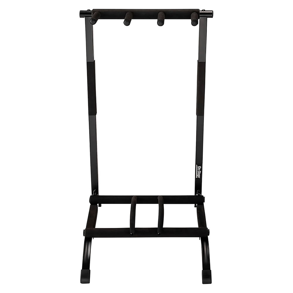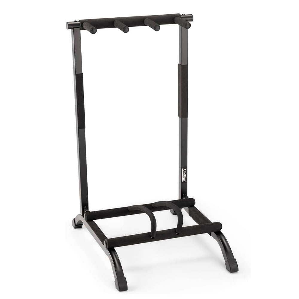 Ideal para conciertos, nuestro estante para guitarra múltiple plegable de tres espacios GS7361 ofrece todos los beneficios de un estante para guitarra permanente pero se pliega fácilmente para un almacenamiento y transporte eficientes. Hasta tres guitarras están dispuestas en fila india para un acceso sin obstáculos a cada instrumento. Se incluyen divisores que se pueden agregar a los rieles inferiores para garantizar que los cuerpos de la guitarra no choquen entre sí. Todos los puntos de apoyo y divisores de la guitarra están acolchados para proteger los acabados de la guitarra. La amplia base de cuatro puntos proporciona estabilidad y equilibrio para un soporte confiable del instrumento. Para mantenerse al día con los equipos en constante cambio, este estante tiene capacidad para cualquiera de las siguientes combinaciones de guitarras: dos acústicas y una eléctrica, dos eléctricas y una acústica, o tres eléctricas.