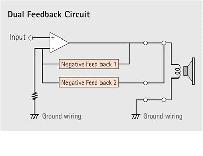 salida de potencia estable de 250 W con alta eficiencia al tiempo que minimiza el consumo de energía y la producción de calor. No requiere una bobina de filtro de salida, lo que resulta en un ruido y una distorsión extremadamente bajos. La respuesta transitoria de alta velocidad también es excelente. El circuito de retroalimentación dual reduce la distorsión al aplicar retroalimentación dos veces, lo que resulta en un sonido más alto
