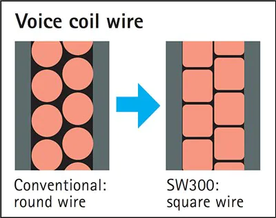 Se utiliza una unidad de woofer grande de 25 cm (10”) en una configuración frontal. La bobina de voz de la unidad de altavoz emplea un cable cuadrado con un área de superficie amplia que se puede enrollar más densamente para obtener una mayor densidad de flujo magnético. Ofrece una gran fuerza de transmisión, lo que permite una reproducción de graves estrecha y profunda.